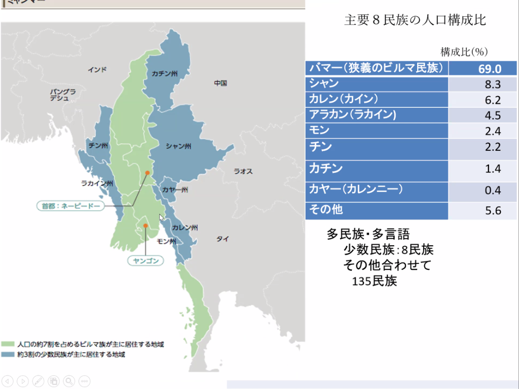 冨永会員が「ミャンマー少数民族について」と題して卓話をしてくださいました。ご自身の研究調査のために何度も通って回られたミャンマー各州の少数民族の様子をNHKの海外紹介番組のようにたくさんの写真を使ってわかりやすく紹介してくださいました。(下記の写真は、冨永会員のご承諾を得て掲載しています)