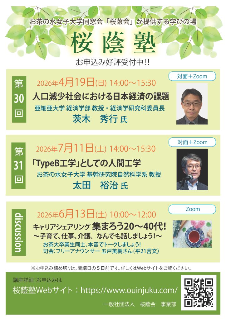 桜蔭塾講座のご案内(2026年4月~7月) 2026年3月12日 最終更新日時 : 2026年3月12日 桜蔭会北海道支部 桜蔭会本部で定期的に開催されている桜蔭塾・新規講座のご案内です。zoomを利用してどこからでも参加が可能でございます。ご興味のある方は、個別に下記のお知らせにありますQRコードまたはメールアドレスよりお申し込みください。